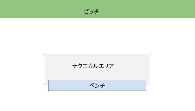 テクニカルエリアは、スタジアムでの試合において用いられるもので、以下に示されるよう、エリア内には、チーム役員、交代要員および交代して退いた競技者の座席が設置される: