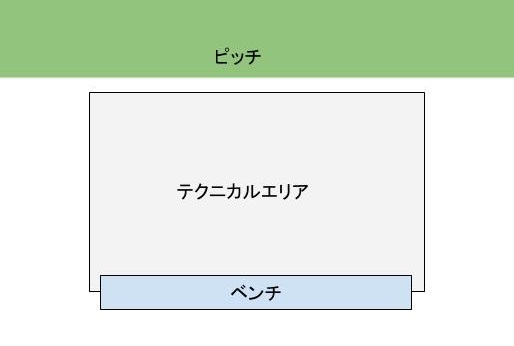 まず、 テクニカルエリアは、特定された座席部分から両横に1m(1ヤード)、前方にタッチラインから、1m(1ヤード)の範囲内でなければならない とは、簡単に言うと、下のようなことです。